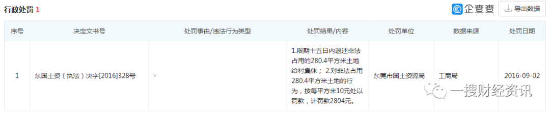 此外,据企查查披露,2016年9月2日,生益电子还因违法占地被东莞市国土资源局处罚,要求限期十五日内退还非法占用的280.4平方米土地给村集体,对非法占用280.4平方米土地的行为,按每平方米10元处以罚款,计罚款2804元。