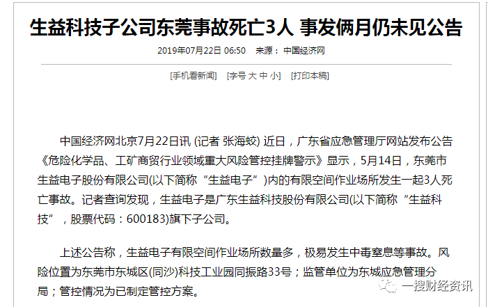 2019年7月22日,中国经济网发表了一篇文章《生益科技子公司东莞事故死3人,事发俩月仍未见公告》。
